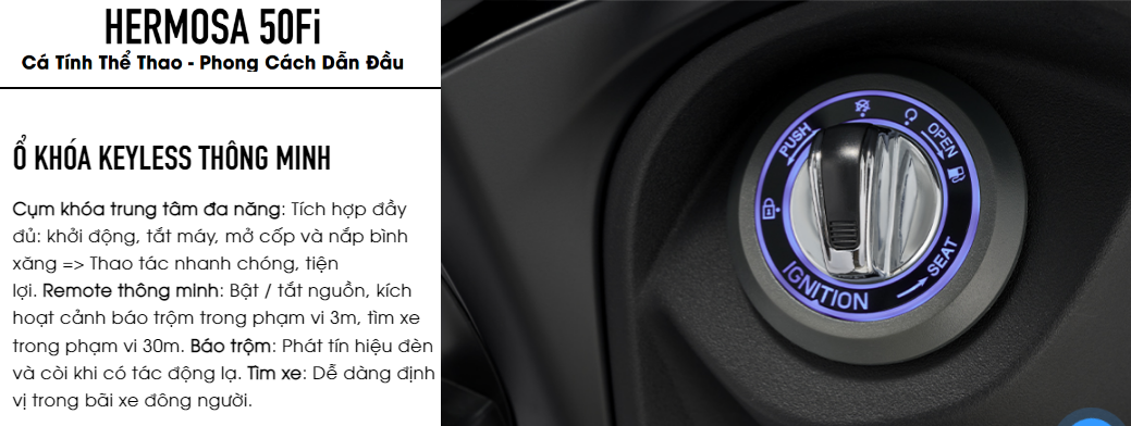 Là thế hệ lớn lên trong thời đại công nghệ số, Gen Z chắc chắn sẽ yêu thích tính năng khóa thông minh KEYLESS mà các xe ga 50 mang lại. Hermosa 50Fi được trang bị khóa Keyless với chức nắng khởi động, tắt máy, tìm xe, chống trộm hiệu quả hơn.